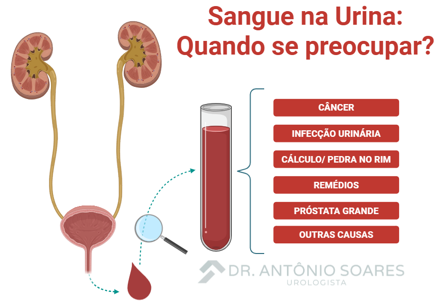 - Outras causas: Traumas, exercícios físicos intensos ou doenças sistêmicas podem também ocasionar sangue na urina.